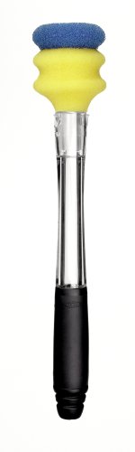 The OXO Good Grips Soap Squirting Glass and Dish Wand deep cleans items with hard-to-reach places like tall stemware, glasses, pitchers, vases, bottles, carafes, tea pots, sippy cups sports bottles, muffin pans and more. Simply unscrew the handle to fill the clear body with soap and press the soft handle end to squirt soap when needed. The unique sponge head is gentle enough to clean stemware and the scrubbing tip gently scrubs away stains and dirt. This dish washing tool has a long clear plastic body to hold the liquid dish soap that you can easily squirt at the push of a button. The sponge of this scrubbing brush features two textures to gently scrub glasses and wipe away.Try it for cleaning muffin or cupcake pans, too.